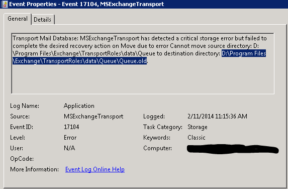 EventID: 17017 - Transport Mail Database: Quota was exceeded while performing a database operation. The Microsoft Exchange Transport service is shutting down. Exception details: Microsoft.Exchange.Isam.IsamVersionStoreOutOfMemoryException: Version store out of memory (cleanup already attempted) (-1069)5 minutes later, my transport service automatically restarts itself. Now the QUEUE.old folder is back, but the service is still running.